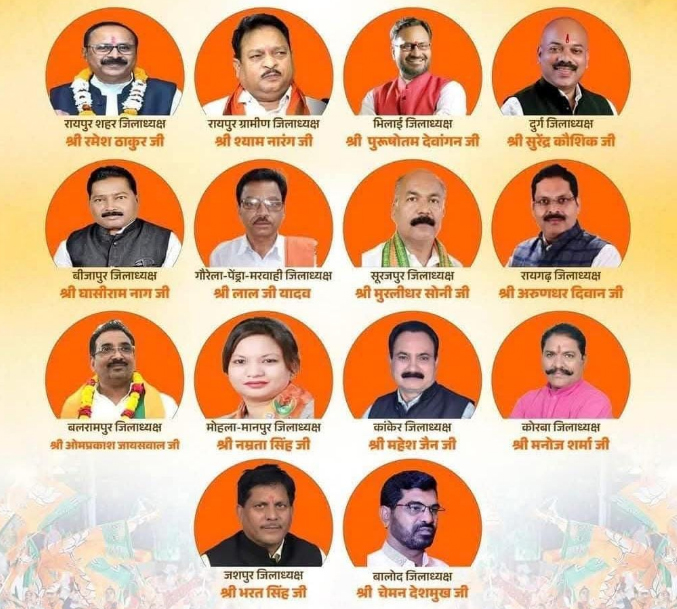 भाजपा जिला अध्यक्षों की घोषित सूची इस प्रकार है : रायपुर (शहर) जिला - रमेश ठाकुर, रायपुर (ग्रामीण) जिला - श्याम नारंग, कांकेर जिला - महेश जैन, भिलाई जिला - पुरुषोत्तम देवांगन, दुर्ग जिला - सुरेंद्र कौशिक, बीजापुर जिला - घासीराम नाग, गौरेला पेंड्रा मरवाही जिला - लालजी यादव, बालोद जिला - चेमन देशमुख, सूरजपुर जिला - मुरलीधर सोनी, मुंगेली जिला - दीनानाथ केशरवानी, रायगढ़ जिला - अरुणधर दीवान, बलरामपुर जिला - ओमप्रकाश जायसवाल, जशपुर जिला - भरत सिंह, चौकी मोहला मानपुर जिला - श्रीमती नम्रता सिंह और कोरबा जिला - मनोज शर्मा।