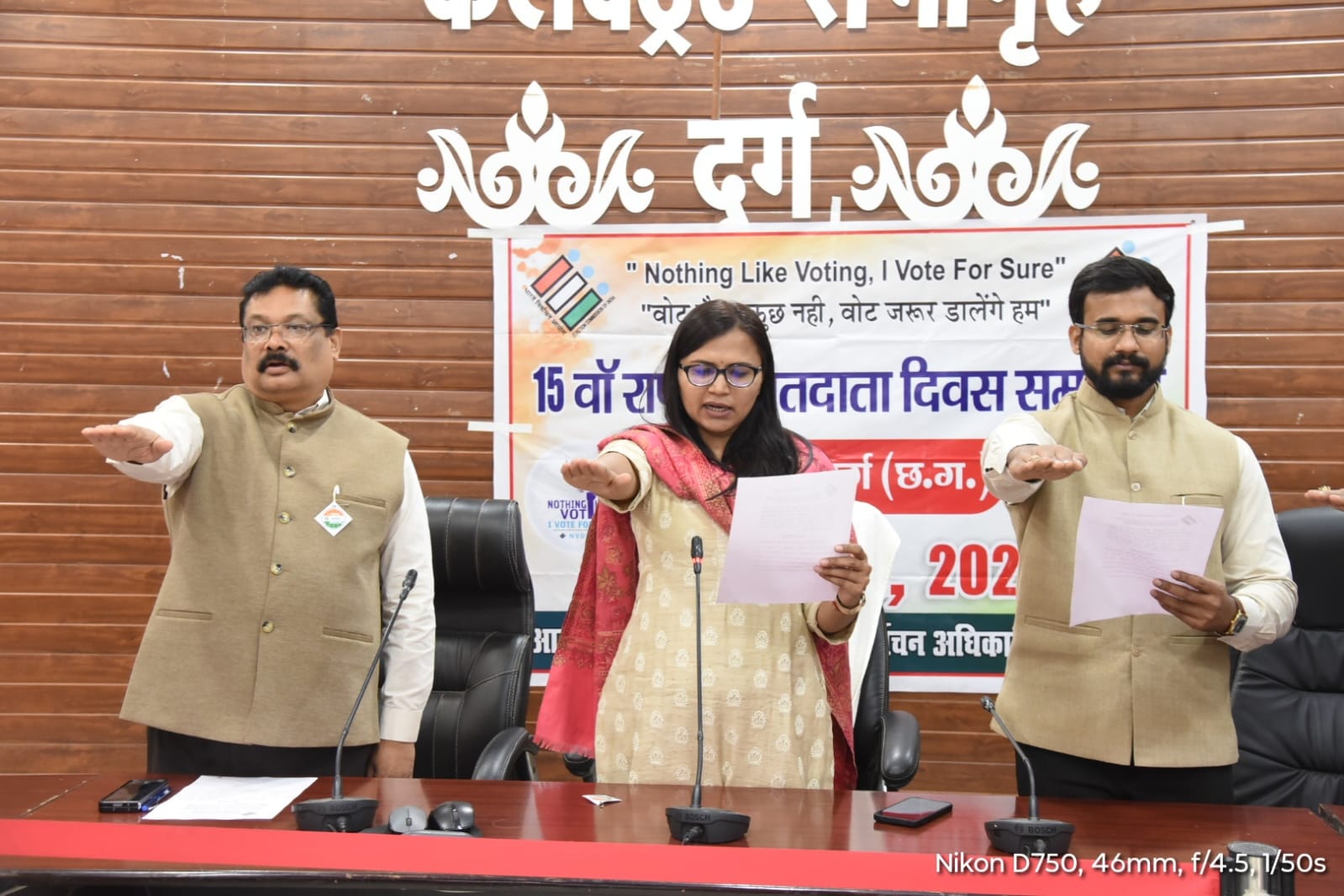 दुर्ग,/ राष्ट्रीय मतदाता दिवस के उपलक्ष्य में निर्वाचन आयोग के निर्देशानुसार आज जिले के सभी विभागों के अधिकारी-कर्मचारियों ने अपने कार्यालय भवन में मताधिकार का प्रयोग करने की शपथ ली। कलेक्टोरेट सभाकक्ष में कलेक्टर सुश्री ऋचा प्रकाश चौधरी ने अधिकारी-कर्मचारियों को मतदान की शपथ दिलाई। शपथ में कहा गया कि "हम, भारत के नागरिक, लोकतंत्र में अपनी पूर्ण आस्था रखते हुए यह शपथ लेते हैं कि हम अपने देश की लोकतांत्रिक परम्पराओं की मर्यादा को बनाए रखेंगे तथा स्वतंत्र, निष्पक्ष एवं शांतिपूर्ण निर्वाचन की गरिमा को अक्षुण्ण रखते हुए, निर्भीक होकर, धर्म, वर्ग, जाति, समुदाय, भाषा, अथवा अन्य किसी भी प्रलोभन से प्रभावित हुए बिना सभी निर्वाचनों में अपने मताधिकार का प्रयोग करेंगे।" इस अवसर पर एडीएम श्री अरविंद एक्का, सहायक कलेक्टर श्री एम भार्गव, उप जिला निर्वाचन अधिकारी अपर कलेक्टर श्री वीरेंद्र सिंह, संयुक्त कलेक्टर श्री एचएस मिरी, एवं सुश्री लता उर्वशा, संयुक्त संचालक कोष एवं लेखा श्री दिवाकर सिंह सहित अन्य अधिकारी एवं कर्मचारीगण उपस्थित थे।