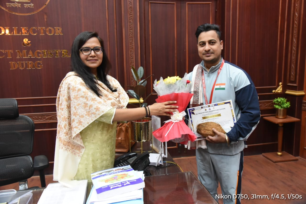 दुर्ग / कलेक्टर सुश्री ऋचा प्रकाश चौधरी से आज कलेक्टर कक्ष में जिले से अखिल भारतीय राष्ट्रीय पैरा आर्म प्रतियोगिता 2025 में शामिल प्रतिभागी खिलाड़ियों ने भेंट की और अपने उपलब्धियों से अवगत कराया। कलेक्टर सुश्री चौधरी ने इन दिव्यांग राष्ट्रीय खिलाड़ियों को श्रीफल व शॉल से सम्मानित किया। साथ ही जिले एवं राज्य का नाम रौशन करने के लिए खिलाड़ियों की उज्जवल भविष्य की कामना करते हुए उन्हें बधाई एवं शुभकामनाएं दी। उल्लेखनीय है कि 17, 18 एवं 19 जनवरी 2025 को अखिल भारतीय राष्ट्रीय पैरा आर्म रेसलिंग प्रतियोगिता-2025 का आयोजन ग्वालियर (मध्यप्रदेश) में किया गया। उक्त प्रतियोगिता में छत्तीसगढ़ के दुर्ग जिले से 04 दिव्यांग खिलाड़ियों ने हिस्सा लिया जिसमें श्री श्रीमंत झा को 01 गोल्ड मेडल, कुमारी परलीन कौर को 05 गोल्ड मेडल, श्री गोस्वामी विजयानंद को 01 गोल्ड मेडल और श्री हर्ष खोडियार को 01 गोल्ड मेडल प्राप्त हुआ है। इस अवसर पर उप संचालक समाज कल्याण श्री अमित सिंह परिहार और विभाग के अन्य कर्मचारी भी उपस्थित थे।