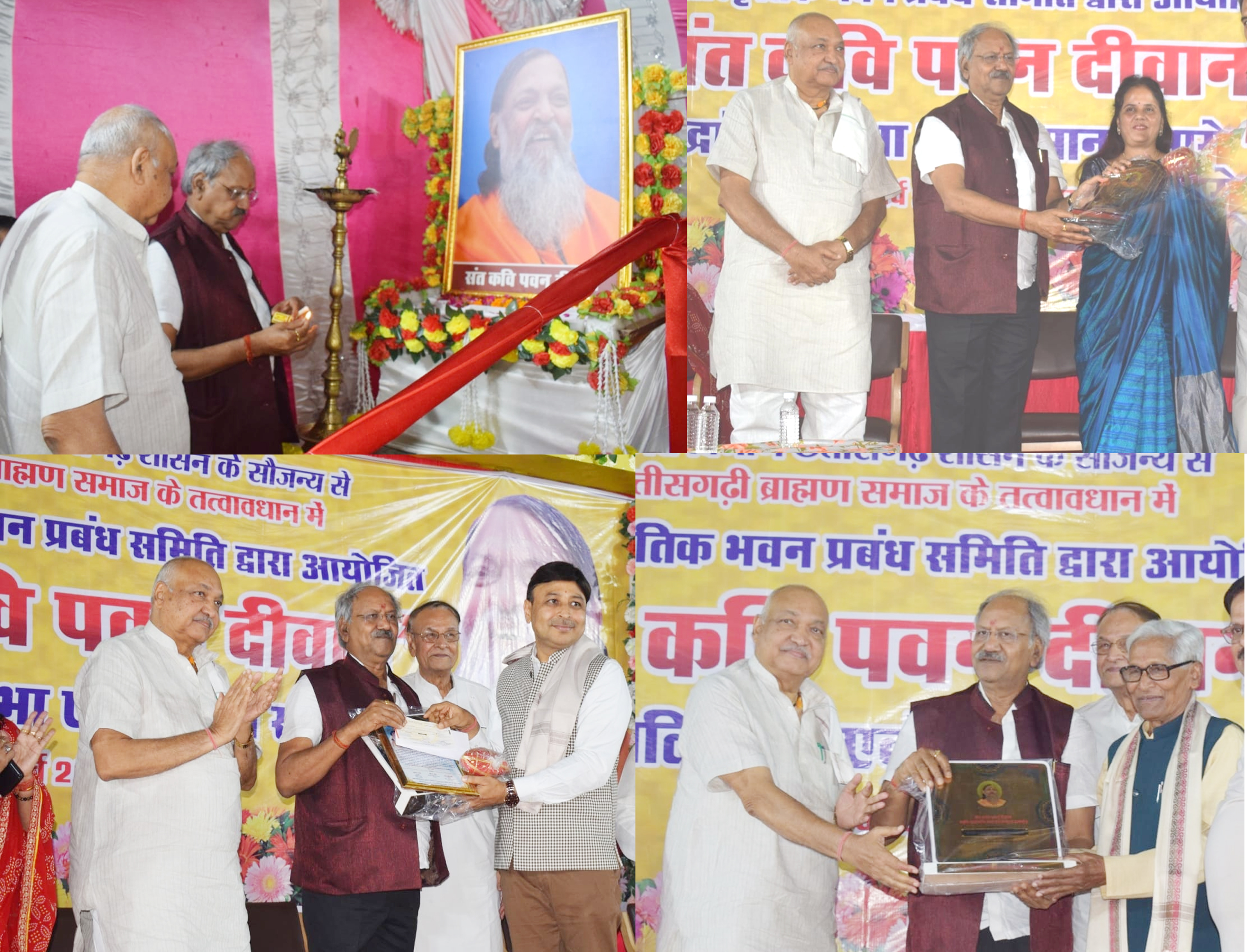 उपरोक्त जानकारी देते हुए छत्तीसगढ़ युवा विकास संगठन के अध्यक्ष ज्ञानेश शर्मा ने बताया कि संत कवि पवन दीवान के स्मृति में संस्कृति विभाग छत्तीसगढ़ शासन के सहयोग से यह कार्यक्रम विगत 8 वर्षों से विप्र सांस्कृतिक भवन प्रबंध समिति द्वारा आयोजित किया जा रहा है। जिसमें छत्तीसगढ़ के संस्कृति और परंपरा को साहित्य के माध्यम से जन-जन तक पहुंचने वाले साहित्यकारों का सम्मान किया जाता है। इस अवसर पर सुभाष तिवारी, मृत्युंजय दुबे, प्रदीप नारायण तिवारी, विनय तिवारी, संजय शर्मा, नटराज शर्मा, सुरेंद्र शुक्ला, के.के. शुक्ला, अविनाश शुक्ला, दिनेश शर्मा, अशोक दीवान, प्रमोद मिश्रा, संजय शर्मा, प्रशांत शर्मा, डा. ध्रुव पांडेय, उमाकांत शर्मा, कमल नारायण शर्मा, प्रदीप पांडे कमलेश तिवारी, वीर अजीत शर्मा, के.के. मिश्रा, राजेंद्र दुबे, विप्र शक्ति महिला मंडल के सदस्य कुसुम शर्मा, विभा तिवारी, प्रीति शुक्ला, भारती किरण शर्मा, आभा मिश्रा, रत्ना मिश्रा, सुनीता दुबे ,सरिता तरुण शर्मा ,कुसुम तिवारी , ममता शर्मा एवं संजीता शुक्ला सहित छत्तीसगढ़ी ब्राह्मण समाज के सदस्य बड़ी संख्या में उपस्थित थे।