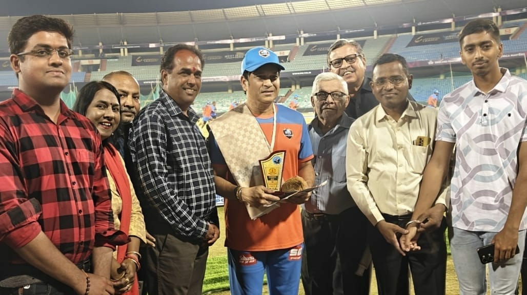 रायपुर। इंटरनेशनल मास्टर्स लीग खेलने के लिए रायपुर पहुंचे ‘क्रिकेट के भगवान’ सचिन रमेश तेंदुलकर का नवा रायपुर स्थित शहीद वीर नारायण अंतरराष्ट्रीय क्रिकेट स्टे्डियम में महाराष्ट्र मंडल ने सम्मान किया। इस मौके पर मंडल के प्रतिनिधि मंडल ने सचिन को महाराष्ट्र मंडल आमंत्रित किया। जिसे उन्होंने अपनी व्यस्तता का हवाला देते हुए अगले रायपुर विजिट में मंडल आने का वादा किया।