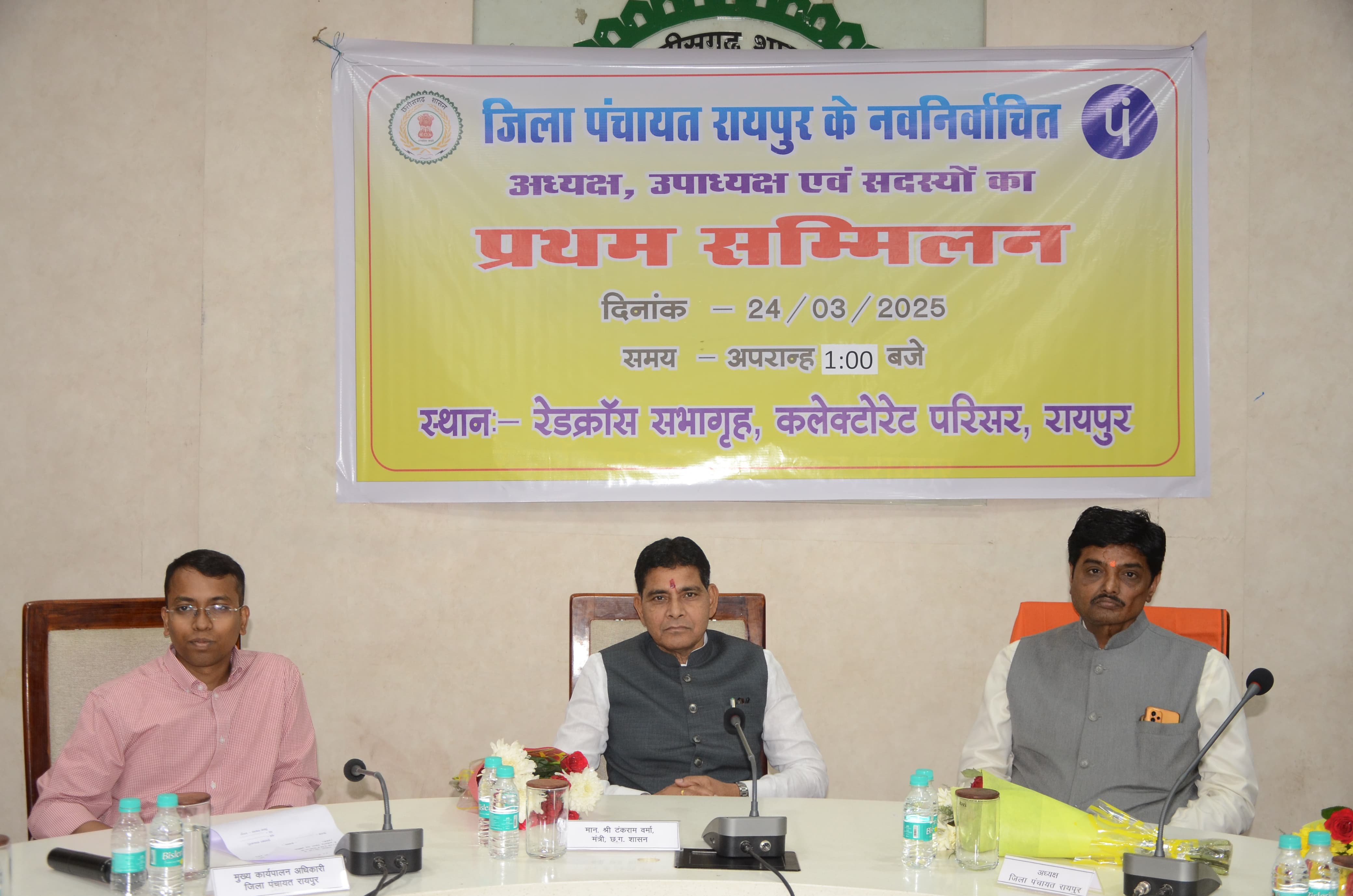 रायपुर/ त्रिस्तरीय पंचायत आम निर्वाचन 2025 के तहत जिला पंचायत रायपुर के नवनिर्वाचित अध्यक्ष, उपाध्यक्ष और सदस्यों का प्रथम सम्मिलन आज कलेक्टोरेट परिसर स्थित रेड क्रॉस सभाकक्ष में आयोजित हुआ। इस अवसर पर जिला पंचायत रायपुर के नवनिर्वाचित अध्यक्ष श्री नवीन कुमार अग्रवाल, उपाध्यक्ष श्री संदीप यदु और अन्य सदस्यों ने शपथ ग्रहण के बाद कार्यभार ग्रहण किया।