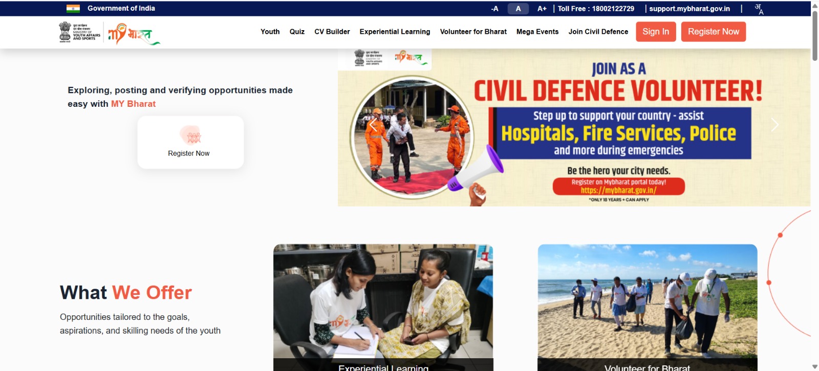 रायपुर। पर्यावरण वन एवं जलवायु परिवर्तन मंत्रालय, भारत सरकार के दिशा निर्देश में पर्यावरण संरक्षण कार्यक्रमों से युवाओं को जोड़ने My Bharat पोर्टल प्रारंभ किया गया है। विशेषकर युवाओं के लिए ही तैयार किये गए इस पोर्टल पर रजिस्टर करने पर युवाओं को भारत सरकार की तरफ से प्रमाण पत्र भी प्रदान किया जा रहा है। पोर्टल के माध्यम से युवाओं को अपने शहर में आयोजित किये जाने वाले कार्यक्रमों की जानकारी मिलेगी और वे अपनी रूचि के अनुरूप कार्यक्रमों में अपनी सहभागिता देकर विकसित भारत की आधारशिला My Bharat पोर्टल में रजिस्ट्रेशन के लिए युवाओं को अपना नाम और मोबाइल नम्बर दर्ज करना होगा। ओ.टी.पी. कन्फर्मेशन के साथ ही युवा को भारत सरकार का प्रमाण पत्र प्राप्त होगा। इस पोर्टल के माध्यम से युवा फायर सर्विसेस, अस्पताल, पुलिस जैसे कई आपातकालीन सेवाओं के लिए स्वयं को सिविल डिफेंस वॉलिंटियर के तौर पर भी रजिस्टर कर सकते हैं। पोर्टल में रजिस्टर के लिए 15 से 29 वर्ष की आयु निर्धारित है। यह पोर्टल एक्सपेरिमेंटल लर्निंग प्रोग्राम के लिए भी युवा इस पोर्टल के माध्यम से रजिस्टर कर सकते हैं। इस पोर्टल के माध्यम से विभिन्न विषयों पर क्विज़ के अलावा शहर में विकसित भारत के लक्ष्य को पूरा करने संचालित गतिविधियों की भी जानकारी प्राप्त है।