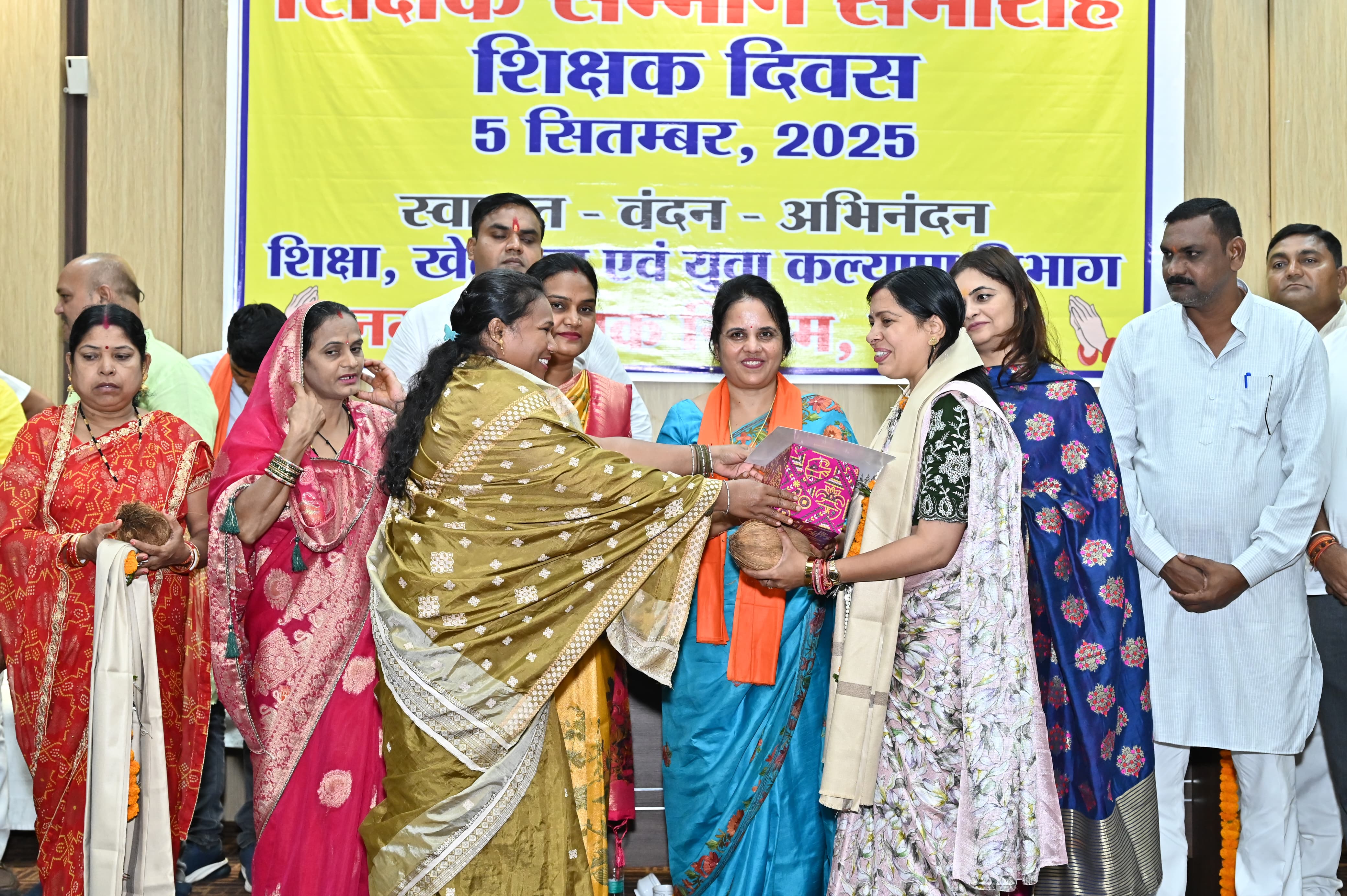 रायपुर/ रायपुर नगर पालिक निगम के शिक्षा, खेलकूद और युवा कल्याण विभाग द्वारा रायपुर नगर निगम मुख्यालय भवन महात्मा गाँधी सदन के चतुर्थ तल पर स्थित निगम सामान्य सभा सभागार में शिक्षक दिवस पर महापौर श्रीमती मीनल चौबे ने सभापति श्री सूर्यकान्त राठौड़, शिक्षा, खेलकूद और युवा कल्याण विभाग के अध्यक्ष श्री नंदकिशोर साहू, एमआईसी सदस्य सर्वश्री महेन्द्र खोडियार, अवतार भारती बागल, दीपक जायसवाल, अमर गिदवानी,खेम कुमार सेन, डॉक्टर अनामिका सिंह,जोन 4 जोन अध्यक्ष श्री मुरली शर्मा,जोन 6 जोन अध्यक्ष श्री बद्री प्रसाद गुप्ता, पार्षद श्रीमती रोनिता प्रकाश जगत, सर्वश्री अजय साहू, देवदत्त द्विवेदी, आनंद अग्रवाल, कैलाश बेहरा, प्रमोद साहू, मोहन साहू, डॉक्टर मनमोहन मनहरे, जनप्रतिनिधि पार्षद प्रतिनिधिगण, नगर निगम अपर आयुक्त श्री विनोद पाण्डेय, प्रभारी अपर आयुक्त श्रीमती कृष्णा खटिक, उपायुक्त श्री जसदेव सिंह बाबरा, कार्यपालन अभियंता श्री गजाराम कँवर, नगर निगम स्कूल शिक्षक संघ के अध्यक्ष श्री मृत्युंजय शुक्ला सहित मंच पर रायपुर नगर निगम की स्कूलों के 63 शिक्षक- शिक्षिकाओं का श्रीफल, शाल, प्रमाणपत्र, स्मृतिचिन्ह प्रदत्त कर नगर निगम रायपुर की ओर से उनका अभिनन्दन किया.