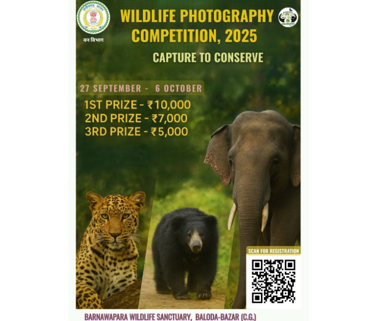 बलौदाबाज़ार -भाटापारा । वाइल्डलाइफ वीक 02 अक्टूबर - 08 अक्टूबर, 2025 के अवसर पर, बारनवापारा वन्यजीव अभयारण्य में "कैप्चर टू कंजर्व" विषय पर वाइल्डलाइफ फोटोग्राफी प्रतियोगिता का आयोजन किया जा रहा है। वन मंडलाधिकारी श्री गणवीर धम्मशील ने बताया कि इस प्रतियोगिता का उद्देश्य वन्यजीवों के संरक्षण के प्रति जागरूकता बढ़ाना है।प्रतियोगिता की अंतिम तिथि 6 अक्टूबर है।प्रतियोगिता में विजेताओं को नकद पुरस्कार दिए प्रथम पुरस्कार ₹10,000, द्वितीय पुरस्कार: ₹7,000 और तृतीय पुरस्कार: ₹5,000 है।