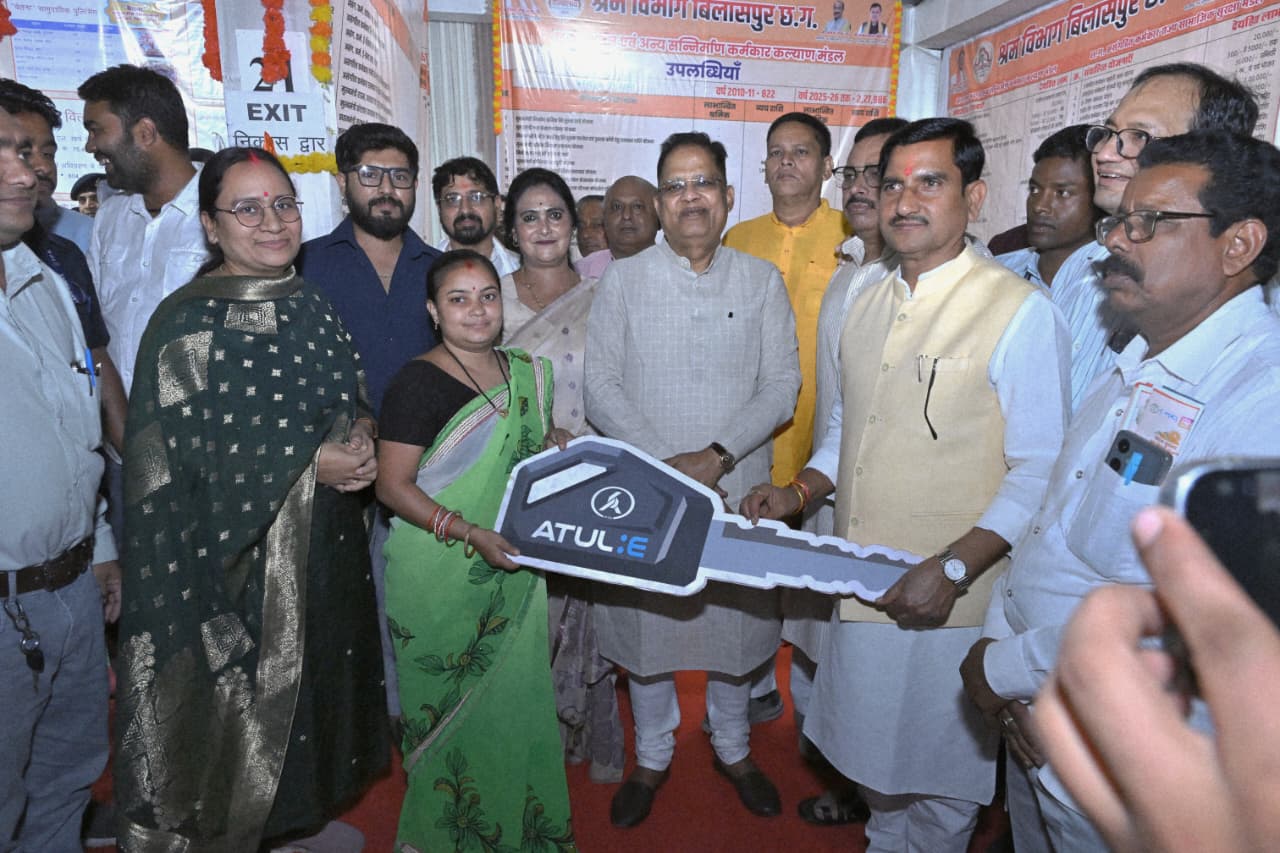 बिलासपुर.जिला स्तरीय राज्योत्सव में केंद्रीय आवासन एवं शहरी विकास राज्य मंत्री श्री तोखन साहू ने श्रम विभाग द्वारा संचालित योजनाओं के हितग्राहियों को चेक वितरित किया। उन्होंने कहा कि राज्य एवं केंद्र सरकार की योजनाएँ आमजन को आत्मनिर्भर बनाने की दिशा में महत्वपूर्ण योगदान दे रही हैं। इस अवसर पर श्रम विभाग द्वारा संचालित योजनाओं का हितग्राहियों को लाभ मिला। मुख्यमंत्री नोनी सशक्तिकरण योजना के अंतर्गत तानिया राठौर को 20 हजार रूपए का चेक तथा दीदी ई-रिक्शा सहायता योजना के अंतर्गत कुसुम साहू को ई-रिक्शा की चाबी सौंपी।