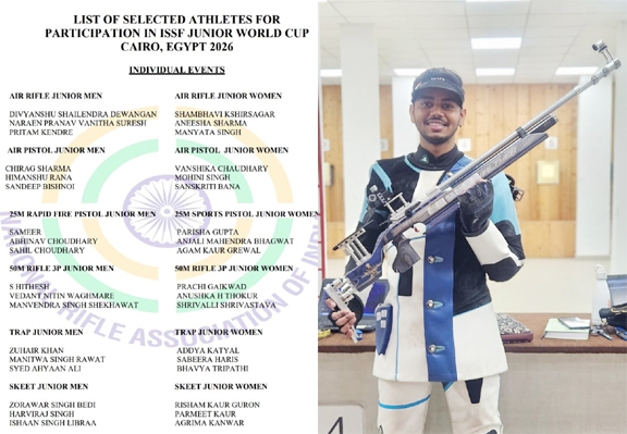 राष्ट्रीय राइफल संघ भारत (NRAI) द्वारा जारी चयन सूची के अनुसार, श्री दिव्यांशु शैलेंद्र देवांगन का चयन 10 मीटर एयर राइफल (जूनियर पुरुष) स्पर्धा में भारत का प्रतिनिधित्व करने के लिए किया गया है। यह चयन उनके निरंतर उत्कृष्ट प्रदर्शन, अनुशासन तथा राष्ट्रीय स्तर की प्रतियोगिताओं में प्राप्त उपलब्धियों का प्रतिफल है।