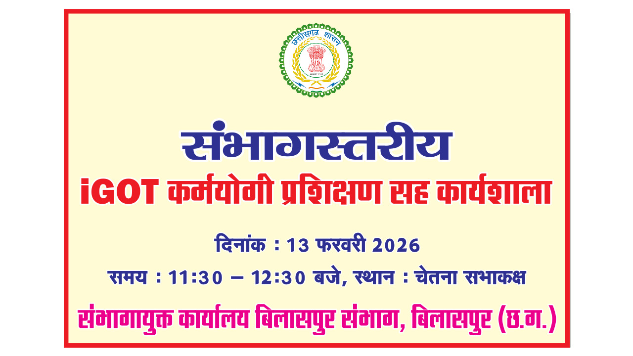 बिलासपुर / सामान्य प्रशासन विभाग के निर्देशानुसार आईगॉट ( iGoT) कर्मयोगी के प्रभावी क्रियान्वयन हेतु कल 13 फरवरी को पूर्वाह्न साढ़े 11 बजे से साढ़े 12 बजे तक संभागायुक्त कार्यालय, कोनी बिलासपुर के चेतना सभा कक्ष में संभाग स्तरीय प्रशिक्षण सह कार्यशाला आयोजित की गई है। संभागायुक्त सुनील जैन की अध्यक्षता में यह प्रशिक्षण होगी। इस अवसर पर राज्य स्तर से सुश्री अंजू सिंह, अवर सचिव, छत्तीसगढ़ शासन एवं नोडल अधिकारी (iGoT कर्मयोगी) अधिकारियों को प्रशिक्षण देंगी। प्रशिक्षण का उद्देश्य अधिकारियों को आईगॉट प्लेटफॉर्म के बेहतर उपयोग के लिए प्रेरित करना तथा उनकी कार्यकुशलता और दक्षता को बढ़ाना है। कार्यक्रम में कलेक्टर, जिला बिलासपुर सहित बिलासपुर जिले के सभी भारतीय प्रशासनिक सेवा एवं राज्य प्रशासनिक सेवा के अधिकारी भौतिक रूप से उपस्थित रहेंगे। वहीं संभाग के अन्य जिलों के कलेक्टर वीडियो कॉन्फ्रेंसिंग के माध्यम से जुड़ेंगे। संबंधित जिलों के नोडल अधिकारी भी प्रशिक्षण में प्रत्यक्ष रूप से भाग लेंगे। यह प्रशिक्षण प्रशासनिक क्षमता निर्माण की दिशा में एक महत्वपूर्ण पहल है, जिससे शासन की योजनाओं के प्रभावी क्रियान्वयन को और गति मिलेगी।