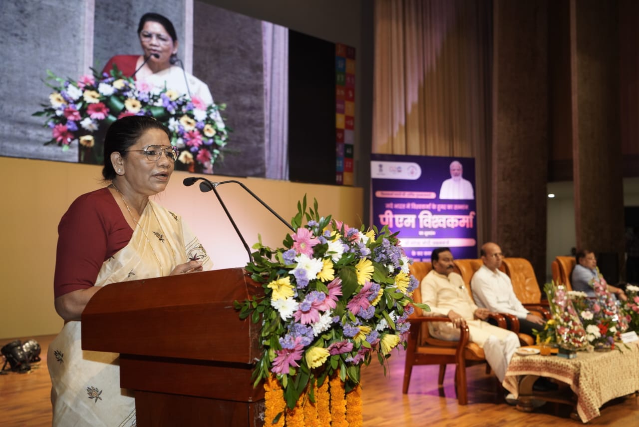 कार्यक्रम को संबोधित करते हुए केंद्रीय जनजातीय कार्य राज्यमंत्री, श्रीमती रेणुका सिंह ने कहा कि हमने पारंपरिक कामों को छोड़ दिया है और उन पारंपरिक कामों को बढ़ावा देने के लिए ही पीएम विश्वकर्मा योजना प्रारम्भ की जा रही है । उन्होंने कहा कि प्रधानमंत्री नरेंद्र मोदी देश के शिल्पकारों और कारीगरों को सशक्त बनाने के लिए लगातार कार्य कर रहे हैं । केन्द्रीय मंत्री ने कहा कि आज शुरू हुई पीएम विश्वकर्मा योजना से न सिर्फ शिल्पकारों- कारीगरों का सम्मान बढ़ेगा बल्कि उनकी आजीविका के अवसर बढ़ेंगे और उनका भविष्य उज्जवल होगा ।