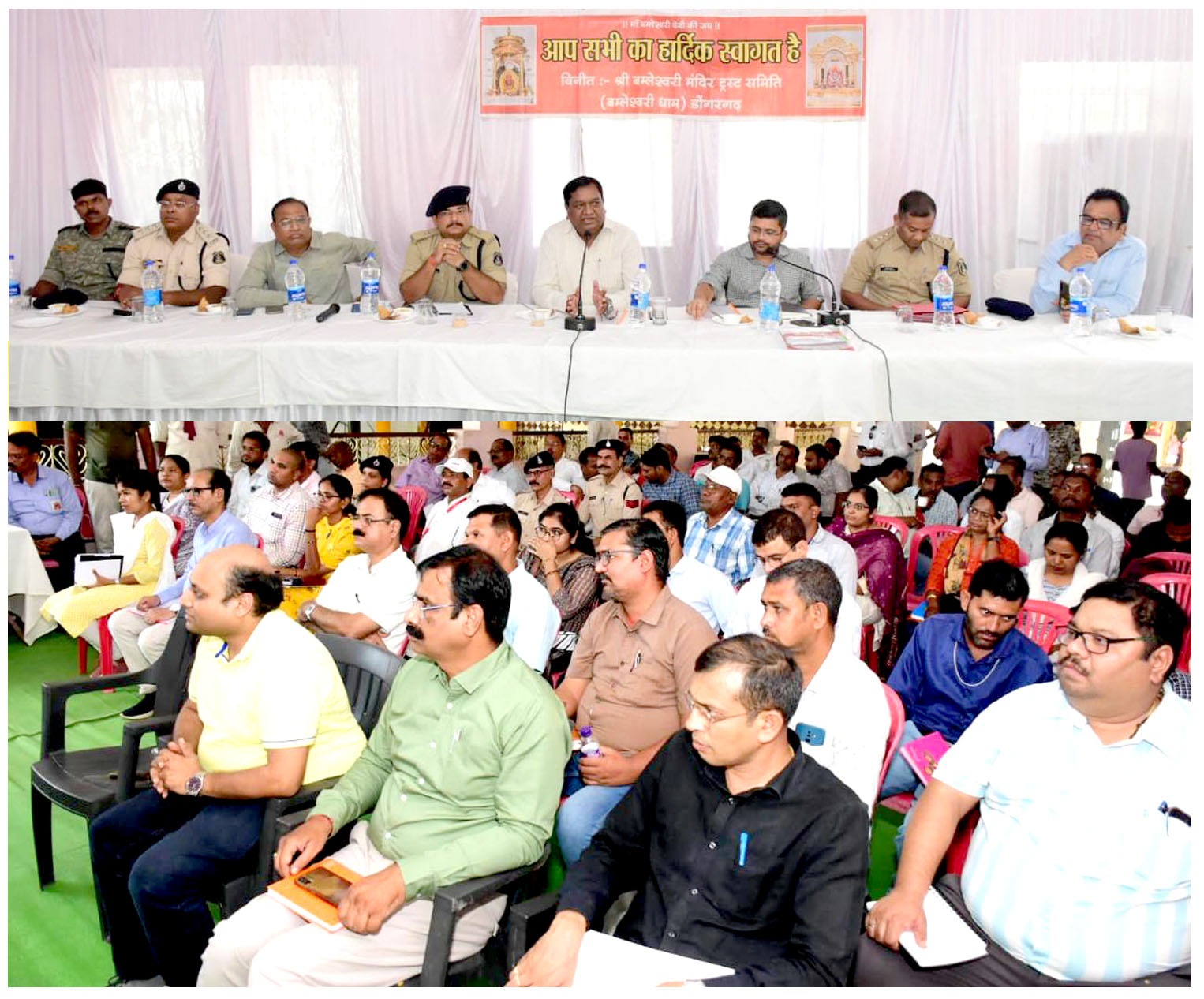 कलेक्टर डोमन सिंह ने डोंगरगढ़ के मां बम्लेश्वरी मंदिर में 15 अक्टूबर से प्रारंभ हो रहे क्वांर नवरात्रि पर्व की तैयारी के संबंध में डोंगरगढ़ छिरपानी परिसर में अधिकारियों की बैठक ली। कलेक्टरने कहा कि श्रद्धा एव आस्था के केंद्र डोंगरगढ़ स्थित मां बम्लेश्वरी मंदिर में बड़ी संख्या में श्रद्धालु एवं पदयात्री पहुंचते हैं। देश, प्रदेश एवं दूर दराज से यहां श्रद्धालु एवं पदयात्री पहुंचते हैं। विधानसभा चुनाव को ध्यान में रखते हुए, सभी अधिकारी अपने दायित्वों का गंभीरतापूर्वक निर्वहन करेंगे। उन्होंने कहा कि हमारी जिम्मेदारी है कि मां बम्लेश्वरी मंदिर आने वाले श्रद्धालुओं एवं पदयात्रियों के लिए अच्छा सेवा पंडाल एवं अच्छी व्यवस्था रहे। बैठक में उन्होंने रोपवे के मेंटेंनेस के संबंध में जानकारी ली। रोपवे संचालक को रोपवे का फिटनेस सर्टिफिकेट देने कहा। उन्होंने कहा कि सुरक्षा सर्वोपरि है। कलेक्टर ने कहा कि सुरक्षा को ध्यान में रखते हुए मेले में चाक चौबंद व्यवस्था होनी चाहिए। कलेक्टर ने पेयजल की नियमित आपूर्ति करने, विद्युत, साफ-सफाई व्यवस्था, बेरिकेटिंग, पार्किंग व्यवस्था तथा अन्य सुविधाएं उपलब्ध कराने के संबंध में विस्तृत दिशा-निर्देश दिए। उन्होंने कहा कि मेला के दौरान भीड़ की स्थिति नहीं होनी चाहिए। इसके लिए पार्किंग एवं अन्य व्यवस्था के लिए योजनाबद्ध तरीके से कार्य करने के निर्देश दिए। पार्किंग के लिए वैकल्पिक व्यवस्था भी होनी चाहिए।