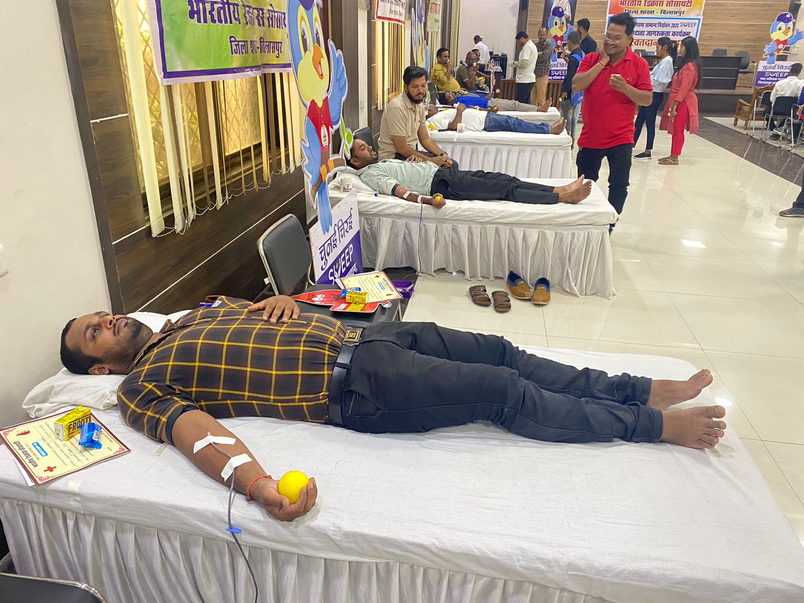 बिलासपुर /भारतीय रेडक्रास सोसायटी बिलासपुर एवं जिला पंचायत बिलासपुर द्वारा प्रार्थना सभाभवन में रक्तदान शिविर और मतदान के प्रति लोगों को जागरूक करने के लिए स्वीप कार्यक्रम आयोजित किया गया। रक्तदान शिविर में जिला पंचायत एवं जनपद पंचायत के स्टाफ द्वारा शिविर के प्रति रूचि दिखाते हुए 21 यूनिट रक्त संग्रहित किया गया। मुख्य चिकित्सा एवं स्वास्थ्य अधिकारी डॉ. राजेश शुक्ला के मुख्य आतिथ्य में शत प्रतिशत मतदान बिलासपुर का अभिमान सूत्र के साथ सभी को मतदान के लिए प्रेरित किया गया। इस कार्यक्रम में 100 से ज्यादा नवीन वोटरों और नववधुओं का सम्मान भी किया गया। कार्यक्रम में श्री मनोज सिन्हा, समन्वयक राष्ट्रीय सेवा योजना, श्री सौरभ सिन्हा, जिला समन्वयक रेडक्रास, ओम पाण्डेय, रामेन्द्र, जनपद पंचायत के सीईओ, अभिजीत, कौशलेन्द्र, रूचि, रीना, सोनिका, अनुराधा, प्रमिल लबरे, आदित्य पाण्डेय सहित बड़ी संख्या में लोग उपस्थित थे।