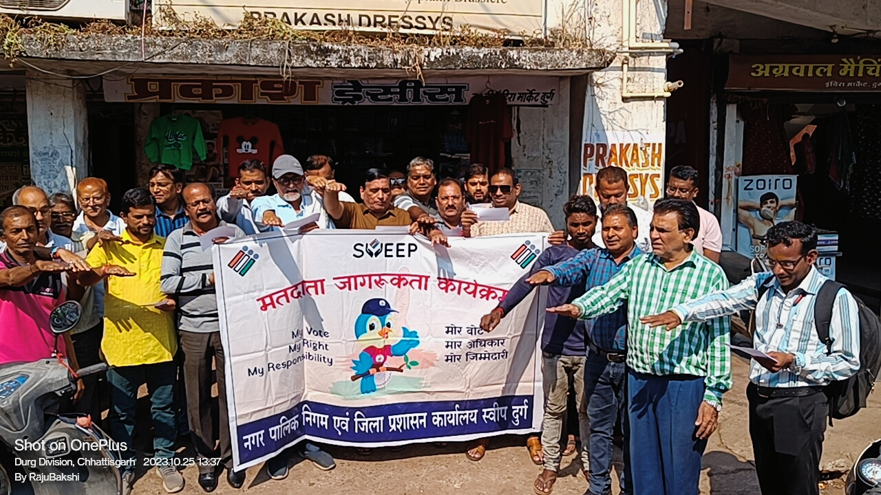 दुर्ग। छत्तीसगढ़ विधानसभा चुनाव को लेकर 17 नवंबर को मतदान होना है। शत-प्रतिशत मतदान के लिए कलेक्टर एवं जिला निर्वाचन अधिकारी पुष्पेंद्र मीणा के आदेश पर दुर्ग नगर निगम द्वारा इंदिरा मार्केट क्षेत्र के व्यापारियो को मोर वोट मोर अधिकार के तहत संकल्प दिलाए जा रहे हैं। बुधवार को बाजार क्षेत्र के इंदिरा मार्केट कुआँ चौक के पास व्यापारियो को शत प्रतिशत मतदान का संकल्प दिलाया गया।दुर्ग नगर निगम के अधिकारी/कर्मचारियो ने आगामी विधानसभा चुनाव में बिना किसी जाति, धर्म,भाषा के भय, लोभ में आए मतदान करने संकल्प दिलाया। अपने मताधिकार का, आइए लोकतंत्र के इस महापर्व का हिस्सा बनें, 100% मतदान कर शहर दुर्ग का नाम रौशन करें,कार्यक्रम के माध्यम से लोगों को जागरूक किया गया कार्यक्रम के दौरान बड़ी संख्या में लोगों ने मतदान करने का संकल्प लिया, वहीं चिर परिचितों व मित्रों तथा पड़ोसियों को प्रेरित करने का भी संकल्प लिया।