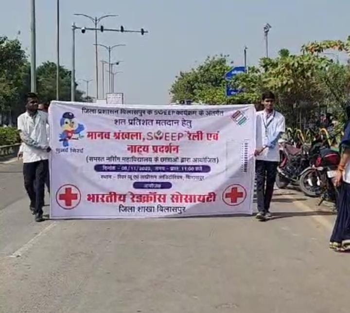 बिलासपुर /जिला प्रशासन द्वारा आयोजित स्वीप कार्यक्रम के तहत भारतीय रेडक्रॉस सोसाइटी जिला शाखा बिलासपुर द्वारा मानव श्रृंखला, स्वीप रैली, मेहंदी प्रतियोगिता एवं नाट्य प्रदर्शन का आयोजन किया गया। मतदाता जागरूकता रैली रिवर व्यू से निकाली गई, जिसमें बड़ी संख्या में सभी नर्सिंग कॉलेजों की छात्र-छात्राएं शामिल हुए। कार्यक्रम कलेक्टर एवं जिला निर्वाचन अधिकारी श्री अवनीश कुमार शरण, जिला पंचायत सीईओ एवं स्वीप के जिला नोडल अधिकारी श्री अजय कुमार अग्रवाल के मार्गदर्शन में संपादित किया गया। इस अवसर पर विशेष रूप से रेडक्रॉस के सचिव डॉ राजेश शुक्ला, जिला समन्वयक रेडक्रॉस श्री सौरभ सक्सेना, पियुली मजूमदार, श्री आदित्य पांडे, श्री लक्ष्मीनारायण मिश्रा, श्री मनीष मिश्रा, श्रीमती गीतेश्वरी चंद्रा आदि सहित बिलासपुर जिले के नर्सिंग महाविद्यालय के लगभग 500 छात्र-छात्राएं एवं शिक्षक गण उपस्थित रहे।