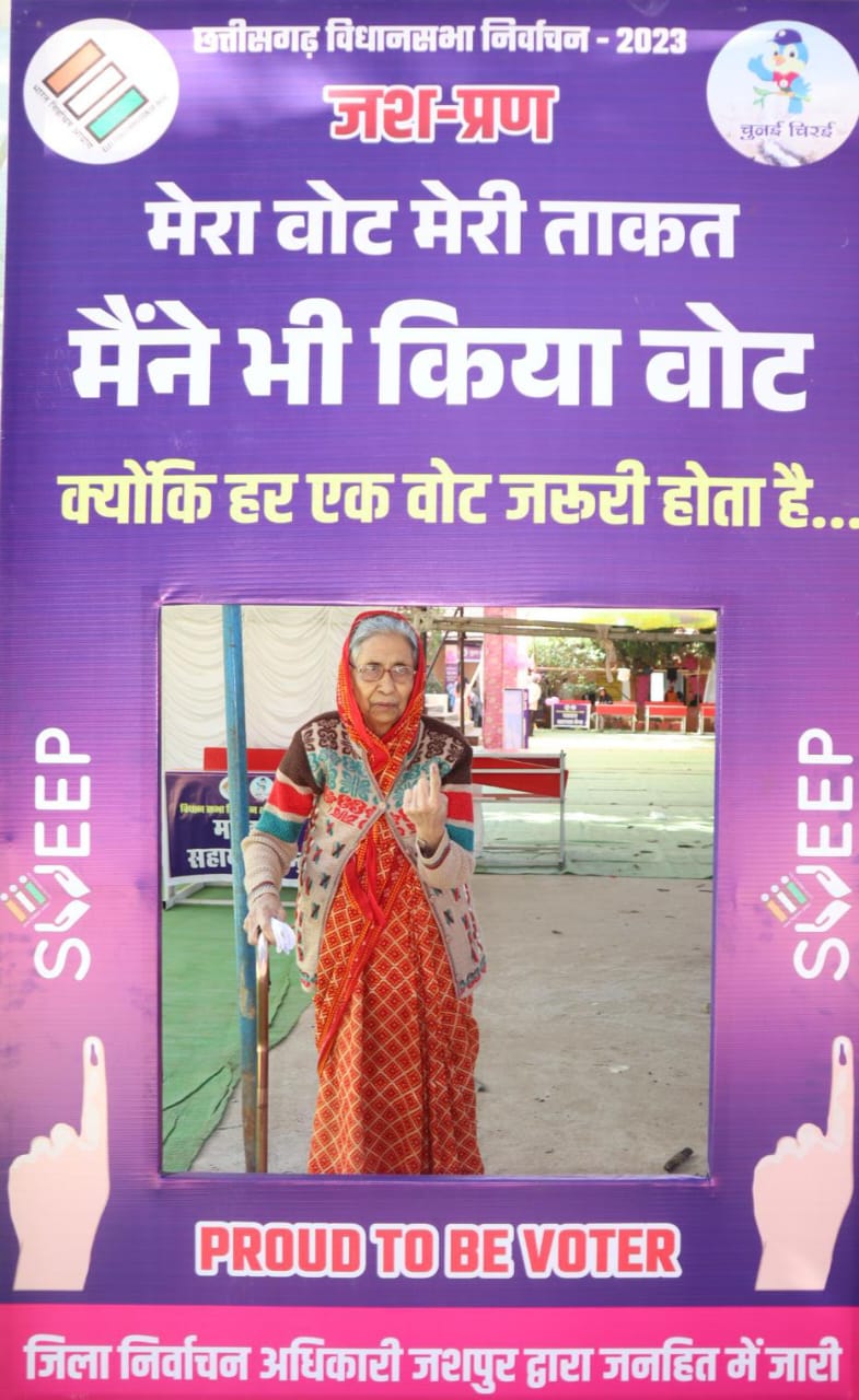 जशपुर / मतदान दिवस के दिन आज दिव्यांग मतदाताओं ने भी बढ़ चढ़ कर मतदान में हिस्सा लिया.। दिव्यांग बुजुर्ग मतदाता श्रीमती बनी फातिमा उम्र 82 साल ने स्वामी आत्मानंद हिंदी मध्यम स्कूल जशपुर बूथ क्रमांक 273 में आ कर मतदान किया और खुशी से सेल्फी लिया।