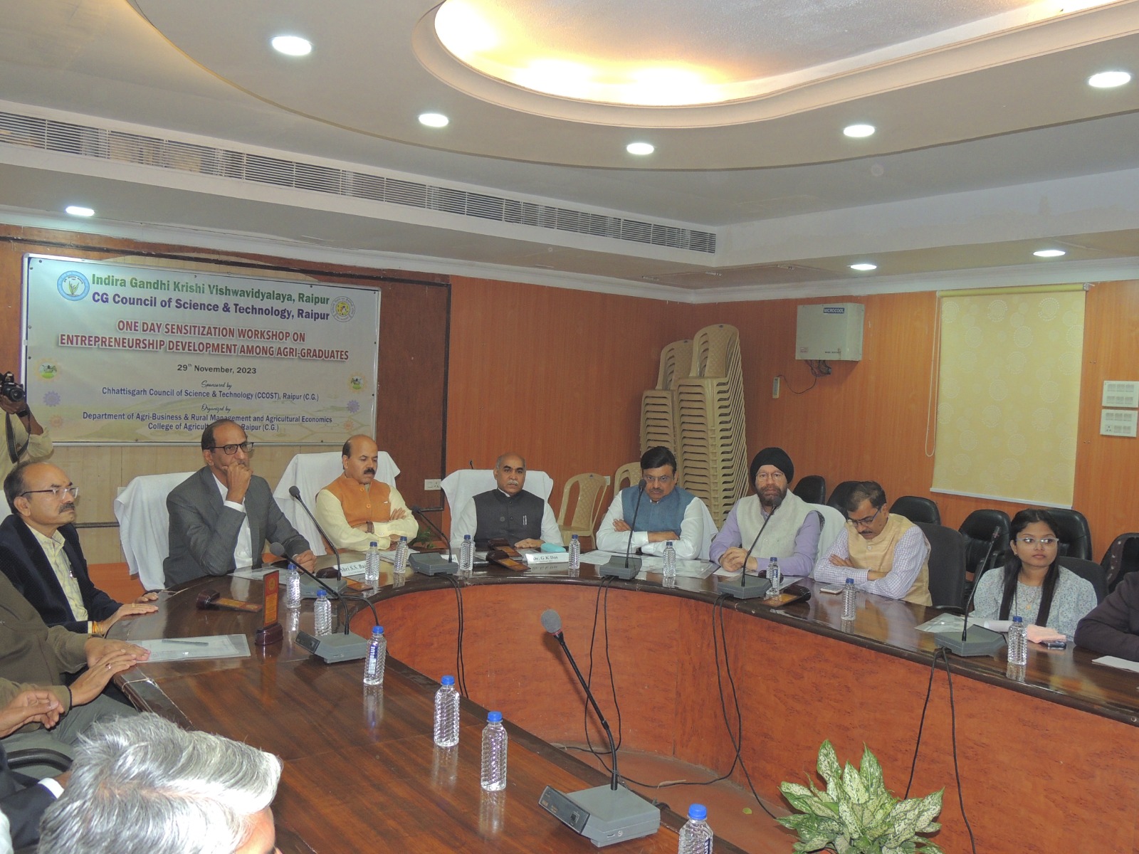 रायपुर । छत्तीसगढ़ विज्ञान एवं प्रौद्योगिकी परिषद एवं इंदिरा गांधी कृषि विश्वविद्यालय रायपुर के संयुक्त तत्वाधान में एकदिवसीय कार्यशाला "कृषि छात्रों में उद्यमिता विकास" पर आयोजित किया गया ।इसके मुख्य अतिथि श्री एस एस बजाज महानिदेशक सी कास्ट एवं विशिष्ट अतिथि डॉ. गिरीश चंदेल कुलपति इंदिरा गांधी कृषि विश्वविद्यालय की गरिमामय उपस्थिती मे सम्पन्न हुआ। कार्यशाला का प्रारंभ दीप प्रजवलन कर अतिथियों का स्वागत डॉ विजय कुमार चौधरी विभागाध्यक्ष, कृषि अर्थशास्त्र के द्वारा किया गया। श्री बजाज ने अपने अध्यक्ष उद्बोधन में छात्रों को उद्यमिता विकास के बहुमूल्य कड़ी कहा एवं कृषि के क्षेत्र में उद्यमिता विकास के अपार संभावना हेतु विज्ञान एवं प्रौद्योगिकी परिषद के विभिन्न कार्यक्रम द्वारा समन्वित विकास व बाजार आधारित नवोन्मेंशी तकनीक पर कार्य करने की प्रेरणा दी । डॉ चंदेल ने छात्रों को कृषि के व्यवसायीकरण एवं बाजार आधारित नवोन्मेषी उत्पादों के प्रबंधन एवं ग्रामीण प्रबंधन के द्वारा राज्य के विकास में सहभागिता बनने हेतु आहवन किया। कार्यशाला के स्वागत उद्बोधन डॉ संजय कुमार जोशी के द्वारा कृषि में उद्यमिता विकास पर प्रकाश डाला एवं इस कार्यशाला का छात्रों पर महत्वपूर्ण प्रभाव एवं विशेषताओं के बारे में बताया ।कार्यशाला के समन्वयक श्री अखिलेश त्रिपाठी वैज्ञानिक डी ने विश्वविद्यालय के साथ-समनवय स्थापित की एवं डॉ प्रवीण कुमार वर्मा के द्वारा समस्त प्रतिभागियों, मुख्य अतिथि, विशिष्ट अतिथि, निर्देशक एवं अधिष्ठाताओं की सहभागिता हेतु धन्यवाद ज्ञापन प्रस्तुत किया।