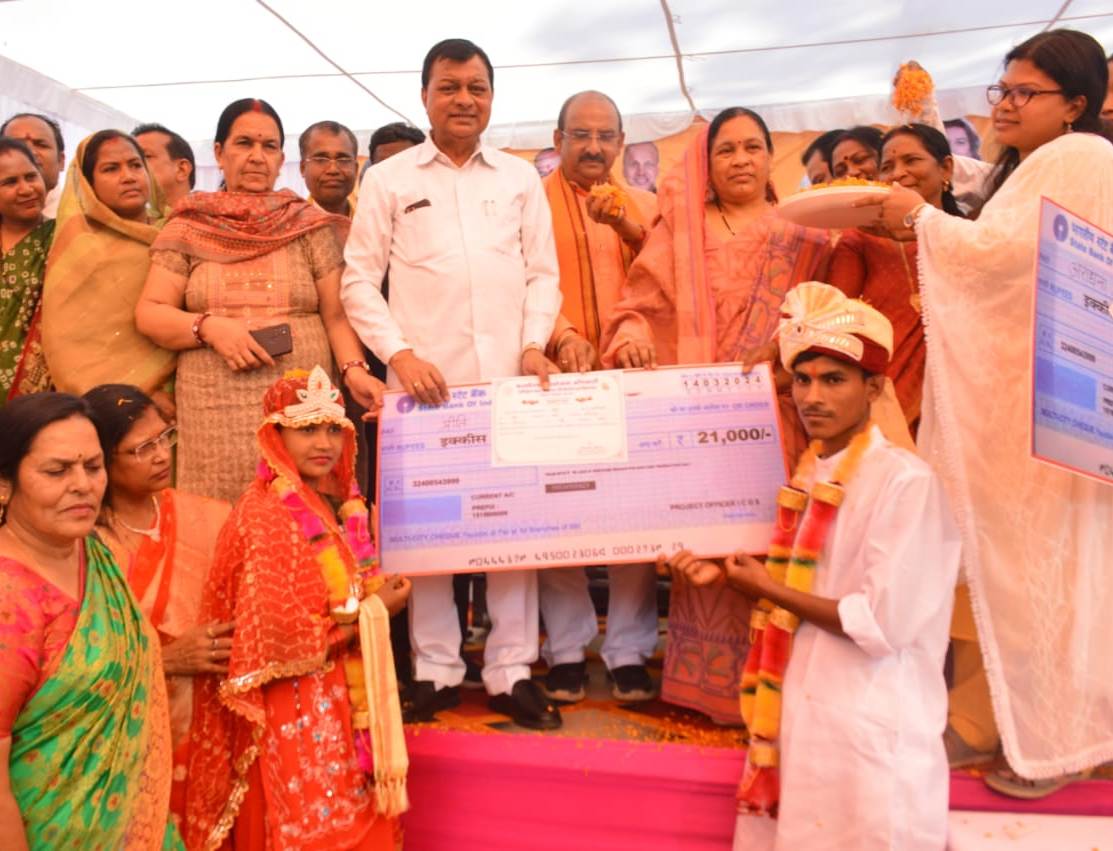 इस दौरान मुख्य अतिथि मंत्री श्री देवांगन सहित अन्य अतिथियों में नवदम्पतियों को अपना आशीर्वाद प्रदान करते हुए भेंट स्वरूप प्रोत्साहन राशि का चेक एवं उपहार सामाग्री प्रदान किया और सुखमय वैवाहिक जीवन की शुभकामनाएं दी। इस अवसर पर छत्तीसगढ़ महिला कोष अंतर्गत सिद्धि स्व सहायता समूह व मातिन दाई स्व सहायता समूह को 1-1 लाख रूपए का चेक भी प्रदान किया गया।