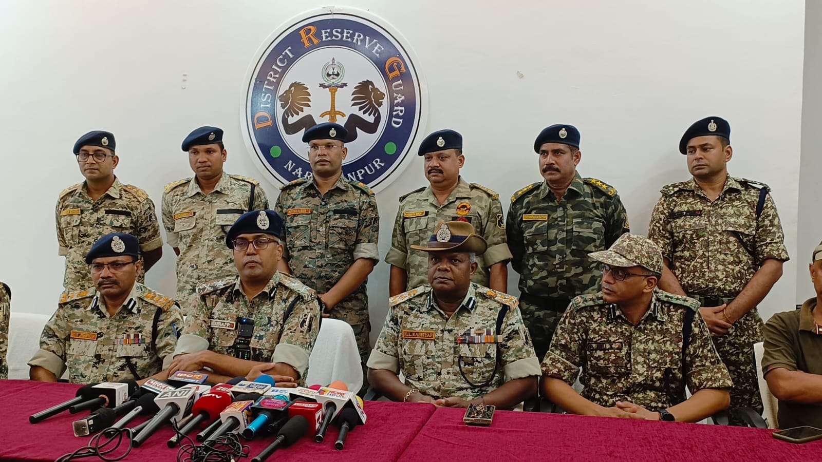 माड़ डिवीजन के माओवादिओं के बीच में हुई मुठभेड़ के संबंध में पुलिस मेस थाना परिसर नारायणपुर में आयोजित की गई पत्रकारवार्ता में पुलिस महानिरीक्षक बस्तर रेंज श्री सुन्दरराज पी, पुलिस उप महानिरीक्षक कांकेर श्री कन्हैया लाल धु्व, पुलिस उप महानिरीक्षक दंतेवाड़ा श्री कमलोचन कश्यप, पुलिस अधीक्षक नारायणपुर श्री प्रभात कुमार, पुलिस अधीक्षक दंतेवाड़ा श्री गौरव रॉय, अति. पुलिस अधीक्षक श्री रोबिनसन गुडिय़ा, पुलिस अधीक्षक एसटीएफ श्री विजय पांडेय, एसटीएफ, आईटीबीपी एवं बीएसएफ के वरिष्ठ अधिकारीगण उपस्थित रहे।