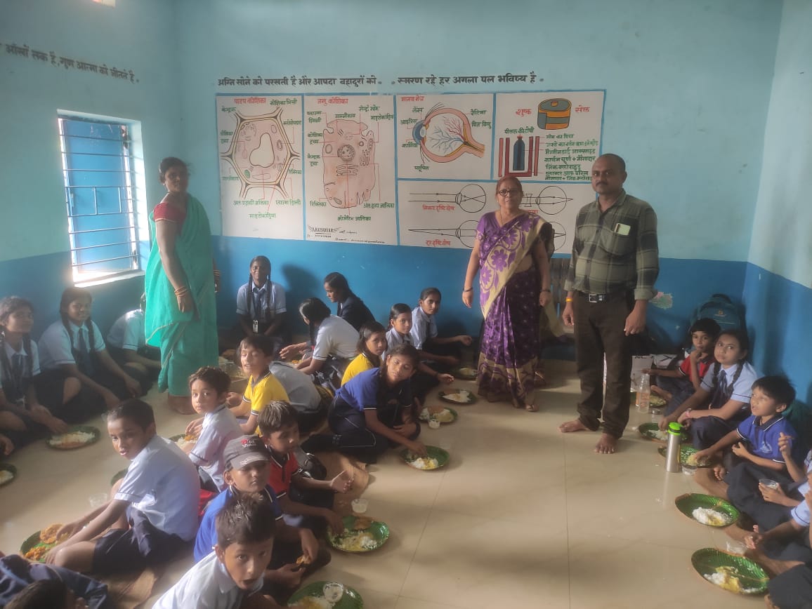 चंदखुरी फार्म स्कूल में शाला प्रवेशोत्सव के अवसर पर विद्यार्थियों को दिया गया न्योता भोज