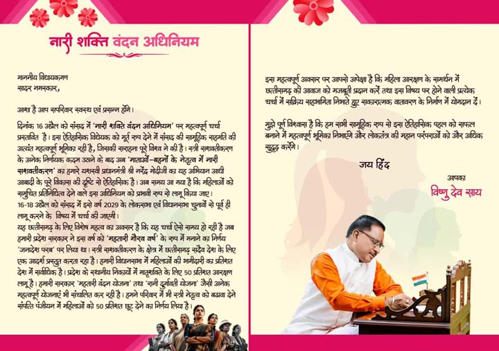 रायपुर/ मुख्यमंत्री श्री विष्णु देव साय ने नारी शक्ति वंदन अधिनियम के प्रभावी एवं समयबद्ध क्रियान्वयन को लेकर छत्तीसगढ़ के सभी लोकसभा एवं राज्यसभा सांसदों, विधानसभा सदस्यों तथा महिला संगठनों को पत्र लिखकर सक्रिय सहभागिता निभाने का आग्रह किया है। उन्होंने 16 अप्रैल 2026 को संसद में नारी शक्ति वंदन अधिनियम पर प्रस्तावित चर्चा को देश के लोकतांत्रिक इतिहास का एक महत्वपूर्ण और निर्णायक क्षण बताते हुए कहा है कि यह मातृशक्ति को लोकतांत्रिक संस्थाओं में समुचित प्रतिनिधित्व दिलाने की दिशा में एक ऐतिहासिक अवसर है।