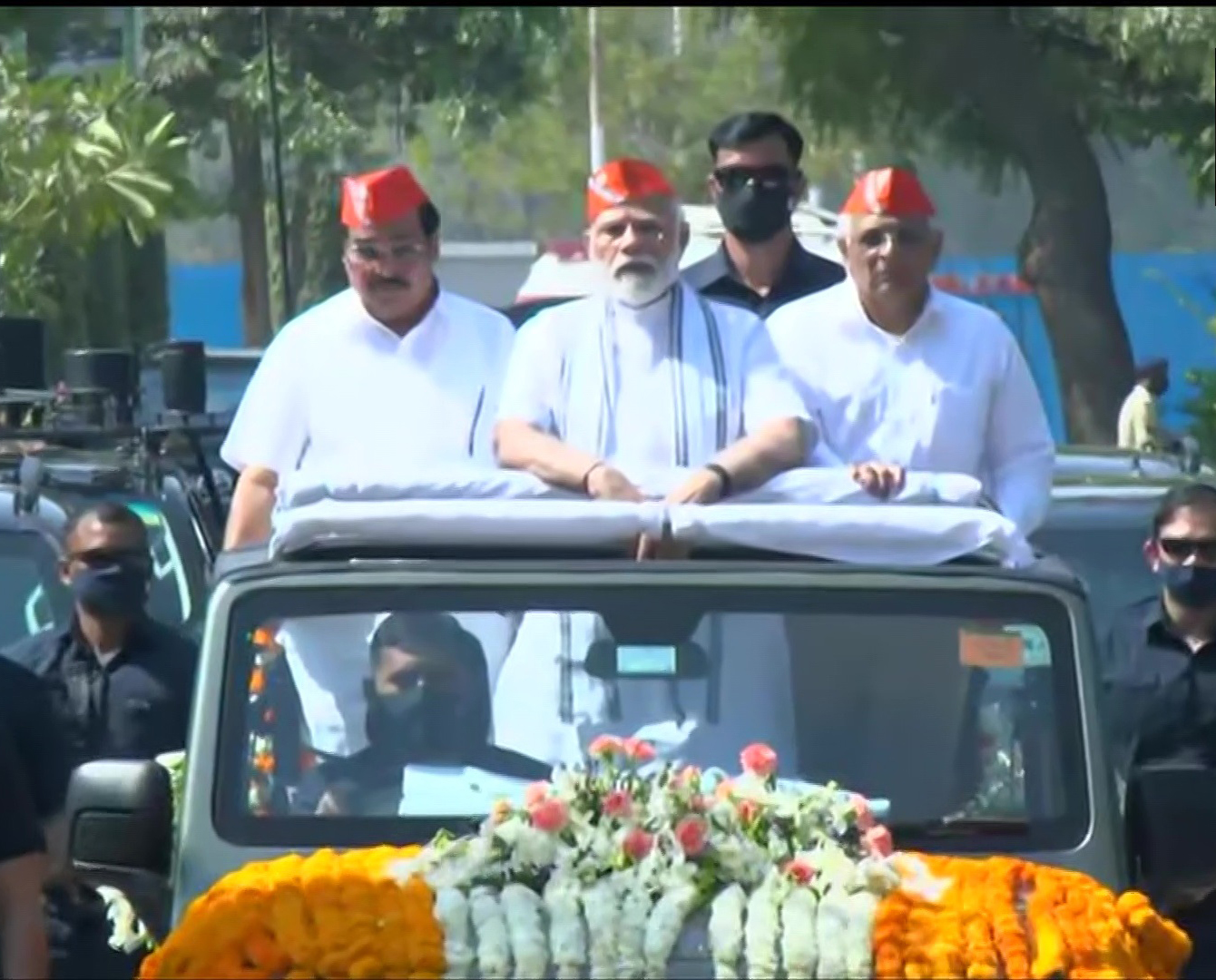अहमदाबाद (गुजरात)। उत्तर प्रदेश, मणिपुर, उत्तराखंड और गोवा विधानसभा चुनाव में भारतीय जनता पार्टी (भाजपा) की जीत के एक दिन बाद प्रधानमंत्री नरेंद्र मोदी ने शुक्रवार को गुजरात में रोड शो किया।फूल मालाओं से सजी गाड़ी में सवार मोदी भगवा रंग की टोपी पहने नजर आए। मोदी ने रोड शो के दौरान सड़क के दोनों ओर जमा सैकड़ों समर्थकों तथा प्रशंसकों का हाथ हिलाकर अभिवादन किया। हवाई अड्डे से शुरू हुआ रोड शो करीब 10 किलोमीटर दूर गांधीनगर में भाजपा के राज्य मुख्यालय ‘कमलम’ पर समाप्त हुआ।गुजरात के मुख्यमंत्री भूपेंद्र पटेल तथा भाजपा की राज्य इकाई के अध्यक्ष सी. आर. पाटिल भी मोदी के साथ मौजूद थे।मोदी ने इस दौरान हाथ से ‘‘वी फॉर विक्टरी (जीत)’’ का चिन्ह बनाया जिसे देखकर उत्साहित समर्थकों ने उनके समर्थन में नारेबाजी की। भाजपा के कई कार्यकर्ता भी रोड शो में शामिल हुए।