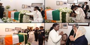 नयी दिल्ली । राष्ट्रपति द्रौपदी मुर्मू ने शुक्रवार को पूर्व प्रधानमंत्री मनमोहन सिंह को यहां उनके आवास पर श्रद्धांजलि दी।भारत के आर्थिक सुधारों के जनक सिंह का बृहस्पतिवार देर रात दिल्ली के अखिल भारतीय आयुर्विज्ञान संस्थान (एम्स) में निधन हो गया। वह 92 वर्ष के थे। राष्ट्रपति कार्यालय ने ‘एक्स’ पर एक पोस्ट में कहा, ‘‘राष्ट्रपति द्रौपदी मुर्मू भारत के पूर्व प्रधानमंत्री डॉ. मनमोहन सिंह के आवास पहुंचीं और उन्हें अंतिम श्रद्धांजलि दी। उन्होंने डॉ. मनमोहन सिंह के परिवार के सदस्यों के प्रति अपनी संवेदना भी व्यक्त की।’’