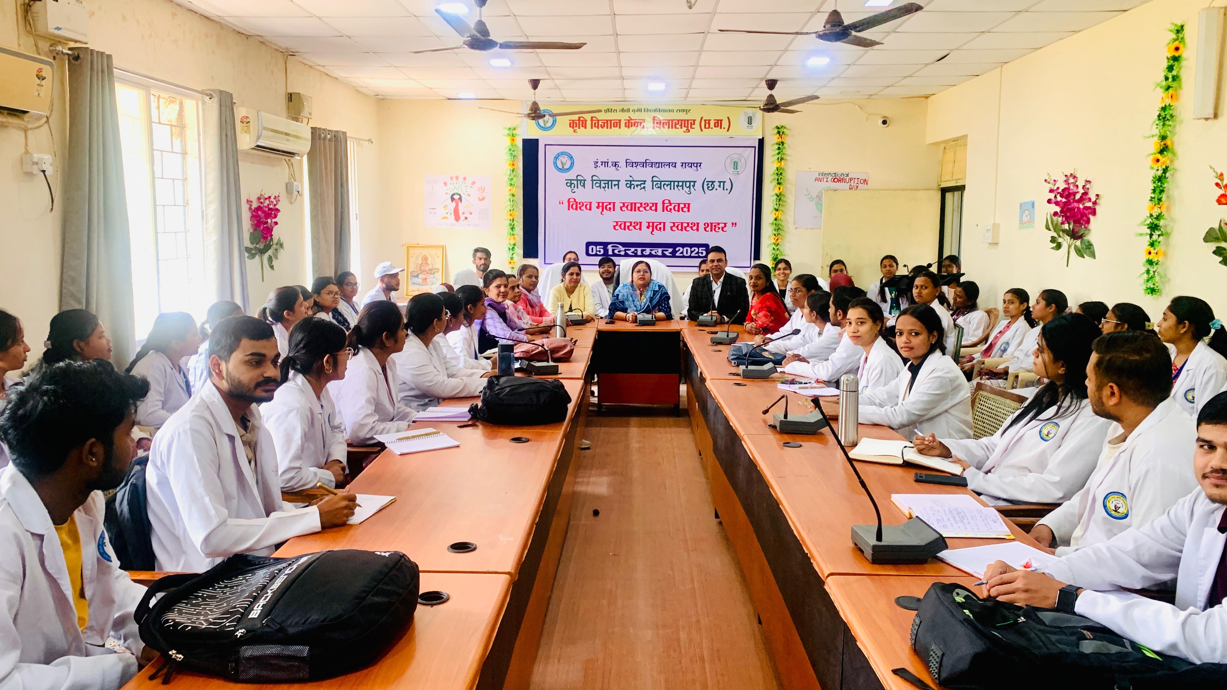 बिलासपुर/विश्व मृदा स्वास्थ्य दिवस के अवसर पर आज कृषि विज्ञान केंद्र बिलासपुर में ‘‘स्वस्थ मृदा स्वस्थ शहर’’ थीम पर आधारित जागरूकता एवं प्रशिक्षण कार्यक्रम आयोजित किया गया। कृषि विज्ञान केन्द्र प्रभारी वरिष्ठ वैज्ञानिक एवं प्रमुख, डॉ. शिल्पा कौशिक ने कार्यक्रम में मृदा स्वास्थ्य के महत्व पर प्रकाश डाला। रासायनिक खादों से मृदा पर होने वाले दुष्प्रभाव की जानकारी दी। साथ ही प्राकृतिक खेती के महत्व के बारे में बताया। इस अवसर पर कृषि विज्ञान केन्द्र के वैज्ञानिक डॉ. अमित शुक्ला द्वारा मिट्टी की महत्ता के बारे में व उसके स्वास्थ्य को किस प्रकार सुधारा जाए इस संबंध में विस्तृत जानकारी दी। श्री जयंत साहू ने मिट्टी की जांच कराने की सलाह दी तथा जांच के उपरांत मृदा स्वास्थ्य कार्ड के अनुसार उर्वरकों के प्रयोग की सलाह दी।