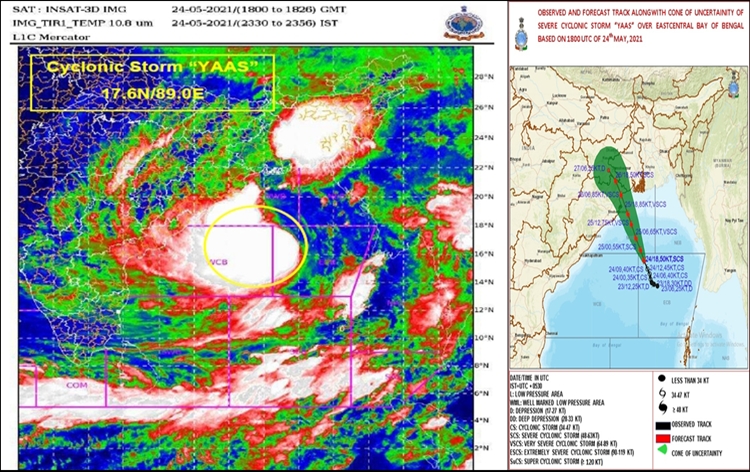 तूफान से ज्यादा प्रभावित होने वाले क्षेत्रों में राहत और बचाव टीमें तैनात। भारतीय मौसम विभाग ने आज कहा कि तूफान यास पिछले छह घंटे में बंगाल की खाड़ी के मध्य पूर्वी भागों से दस किलोमीटर प्रति घंटे की रफ्तार से आगे बढ़ा है। यह पारादीप से 320 किलोमीटर दक्षिण, दक्षिण-पूर्व, बालासोर से 430 किलोमीटर दक्षिण, दक्षिण-पूर्व, दिघा से 420 किलोमीटर दक्षिण, दक्षिण-पूर्व और खेपूपाड़ा से 470 किलोमीटर दक्षिण, दक्षिण-पश्चिम में स्थित है।