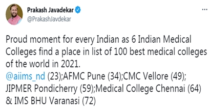 नई दिल्ली। केन्द्रीय मंत्री प्रकाश जावड़ेकर ने प्रसन्नता व्यक्त की है कि भारत के छह मेडिकल कॉलेज 2021 में विश्व के सौ श्रेष्ठ मेडिकल कॉलेज की सूची में शामिल किये गए हैं।